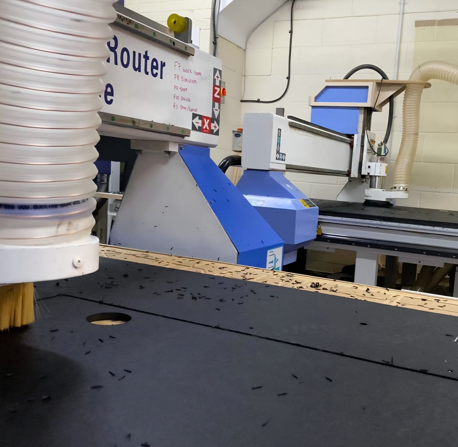 We run multiple CNC routers to ensure we have the capacity and redundancy to meet production deadlines. Our largest machine features a 13ft x 5ft work area, allowing us to handle oversized bespoke projects and long-length components that exceed standard dimensions. Our second machine is dedicated to 8ft x 4ft sheet work, giving us a versatile setup for both one-off builds and repeat production runs.